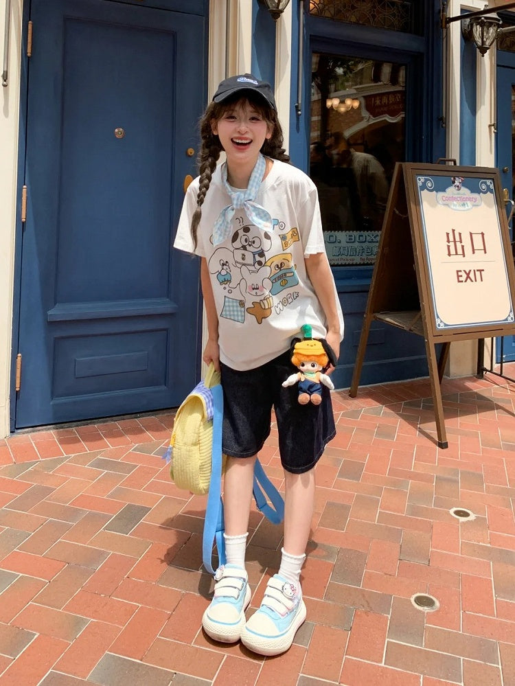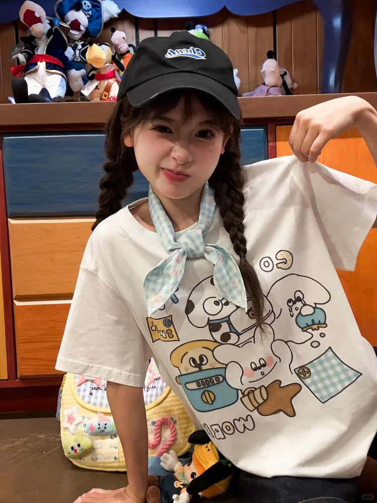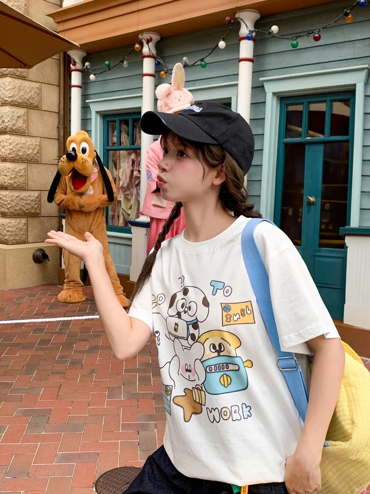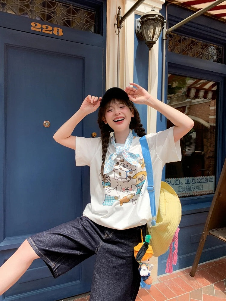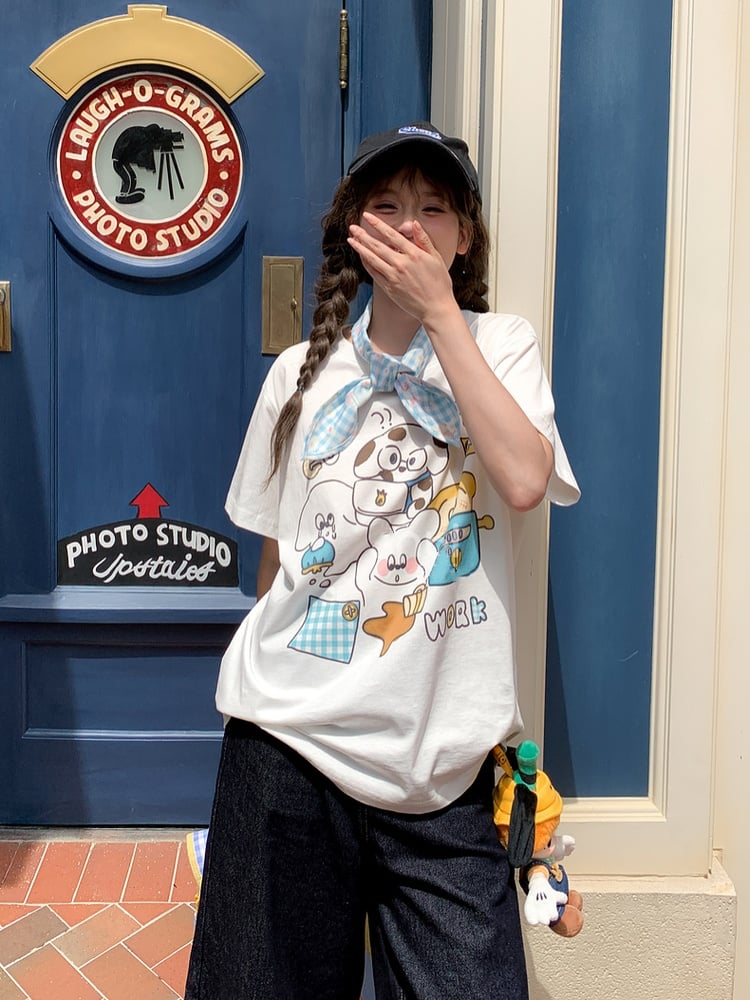 Adorable Animal Print White Round Neck Loose Cotton T-shirt