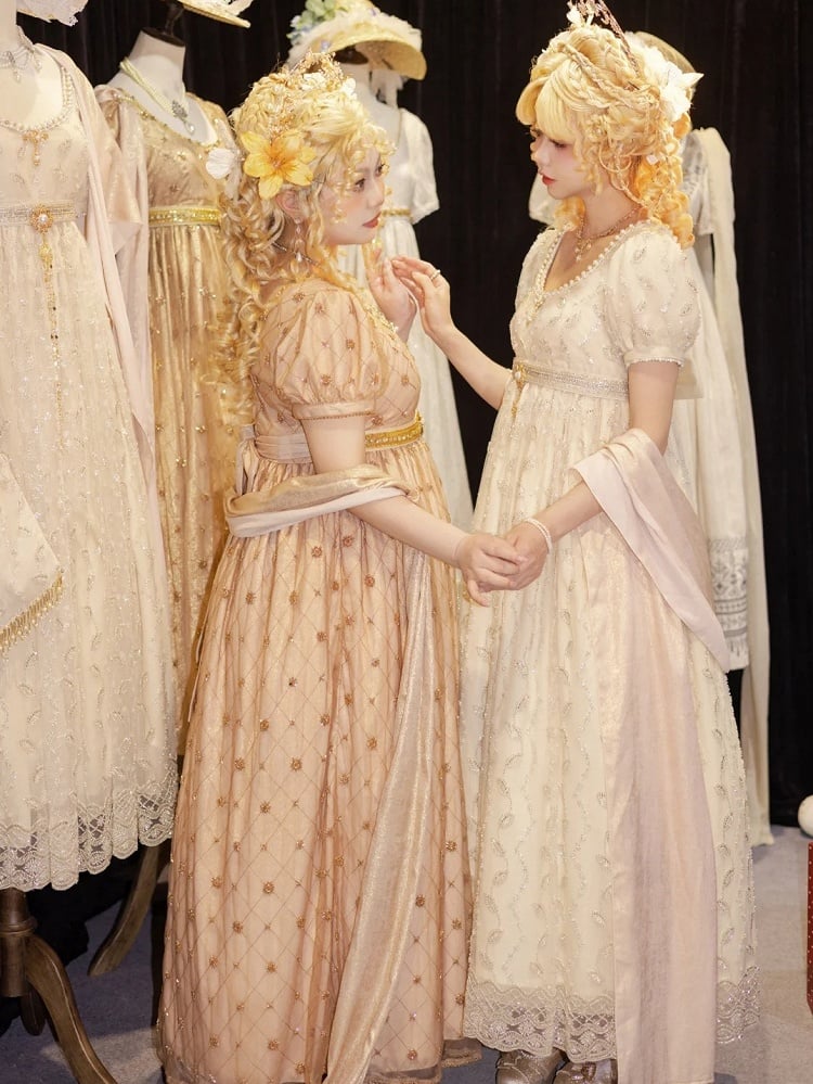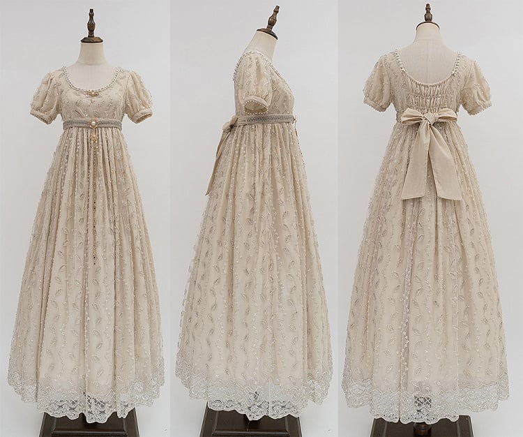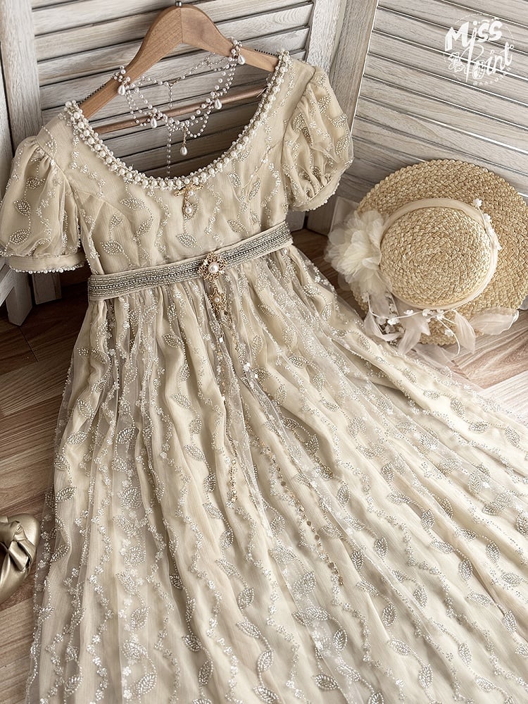 Allover Beaded Leaves Design Beige Empire Waist Elegant Lolita One Piece Long/Short Version