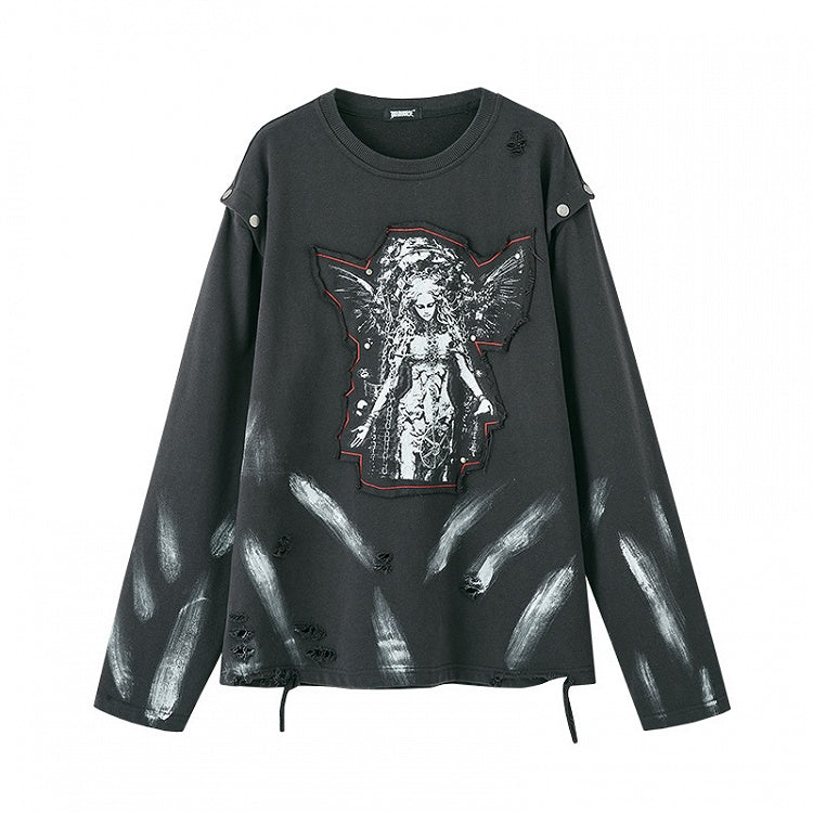 Applique Design Black Cutout Shoulder Faded Wash Distressed Sweatshirt