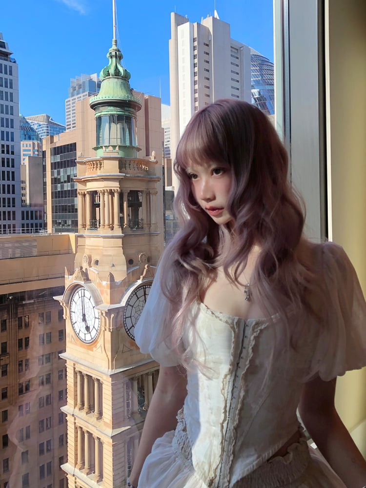 This apricot top features elegant puff sleeves and fine lace neckline. Delicate back lace-up allows adjustable fit. Combines French romantic charm with modern wearability. Versatile for statement looks or layered styling. Embodies timeless sophistication and feminine grace.
