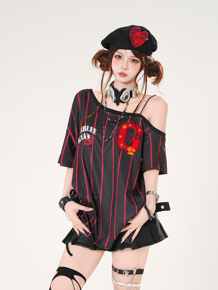 Elevate your wardrobe with this edgy Asymmetrical Neckline Blokette Core Striped T-Shirt. This piece combines the playful spirit of blokette style with a unique twist—its asymmetrical neckline adds an avant-garde flair, perfect for making a bold fashion statement.