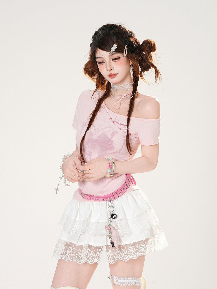 Asymmetrical Neckline Butterfly Print White/Pink Slim-fitting T-shirt