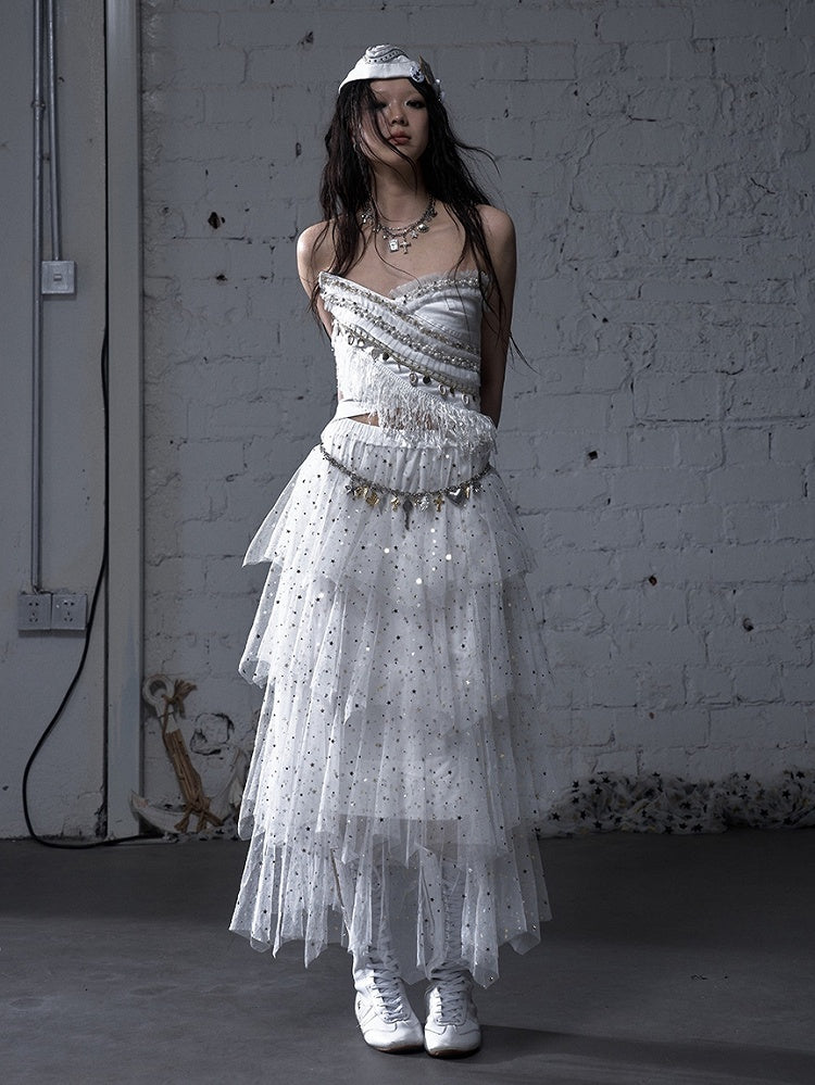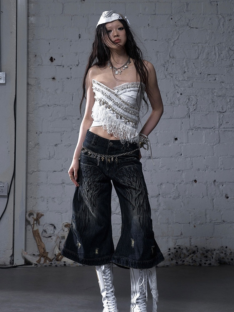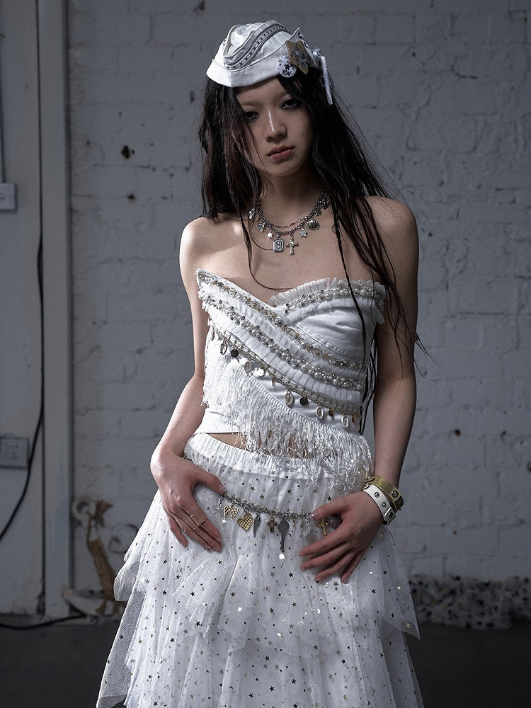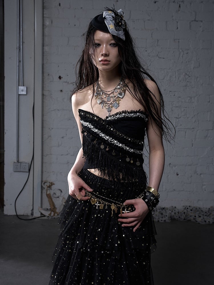 Baroque Bead Details Fringe Hem Black/White Crossover Design Strapless Top