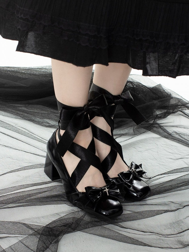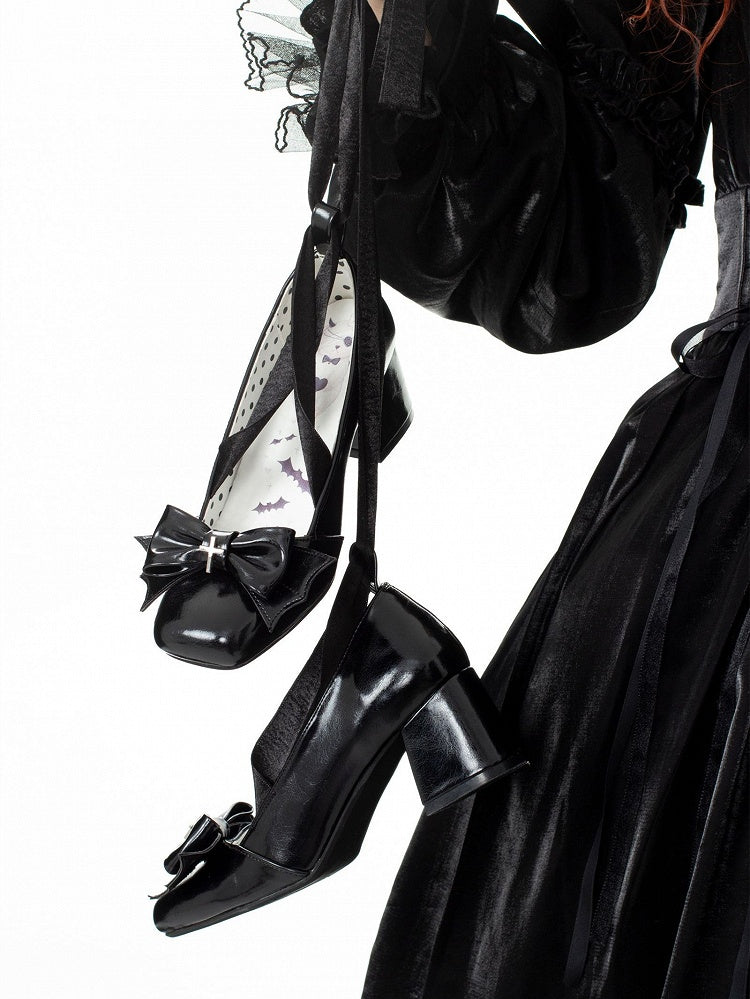 Bat Wings Bow Gothic Black Lace-up Block Heels Balletcore Shoes