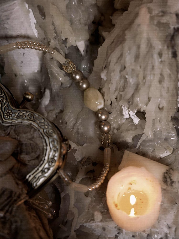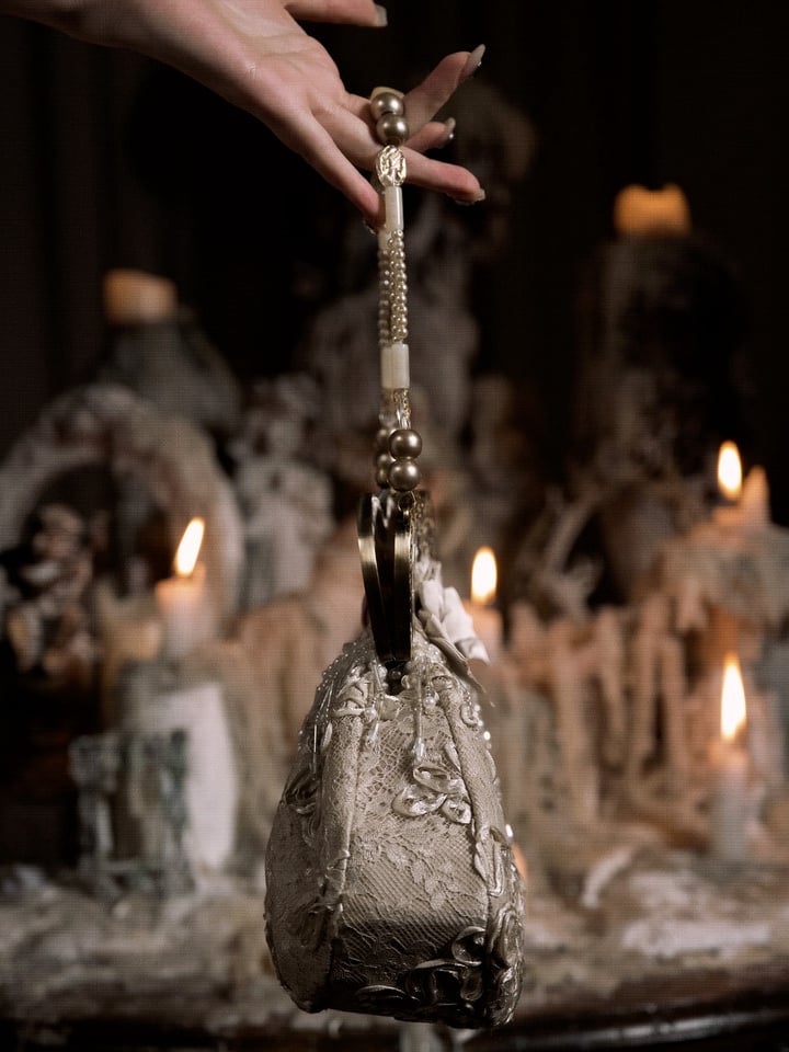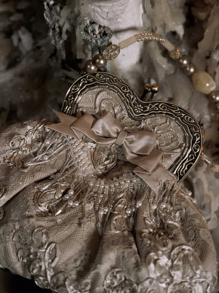 The bag features a charming satin bow accent, crafted from a luxurious satin fabric adorned with dimensional floral embroidery, creating a delicate relief texture. The antique bronze kiss-lock closure is designed with an M-curve that elegantly outlines the upper edge of a heart shape, complementing this design, the heavy-duty pearl tassel gracefully drapes in a V-shape, together forming a complete heart motif with the M-shaped clasp. The handbag is finished with a meticulously hand-aged bead chain handle, adding a touch of vintage sophistication.