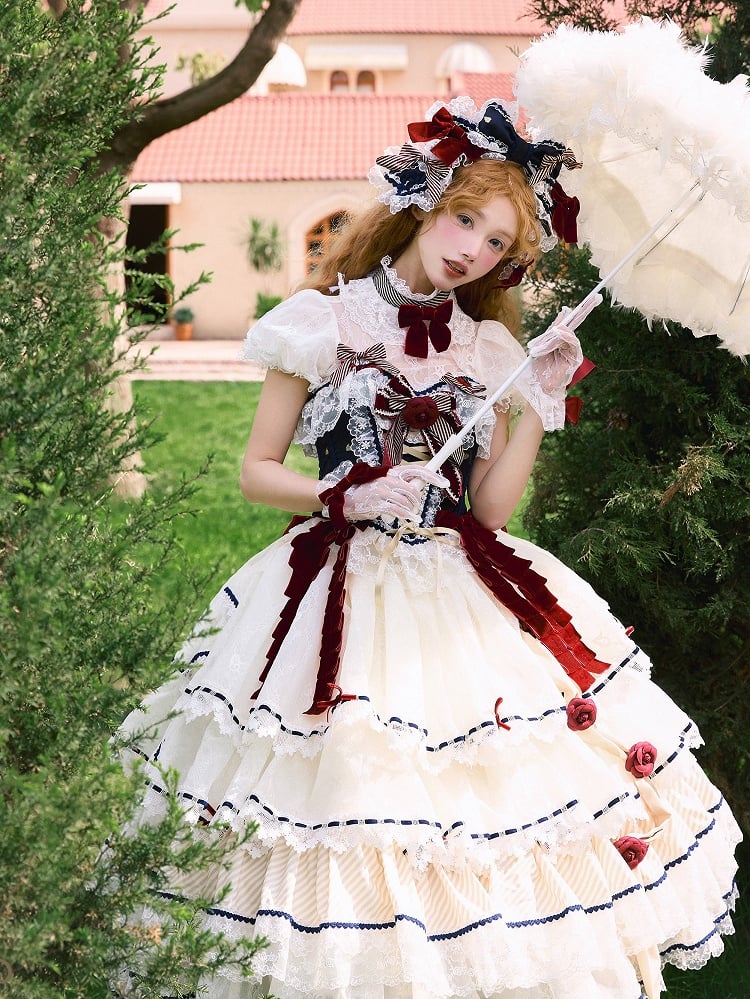 Beige and Dark Blue Lace Blouse with Detachable Sleeves