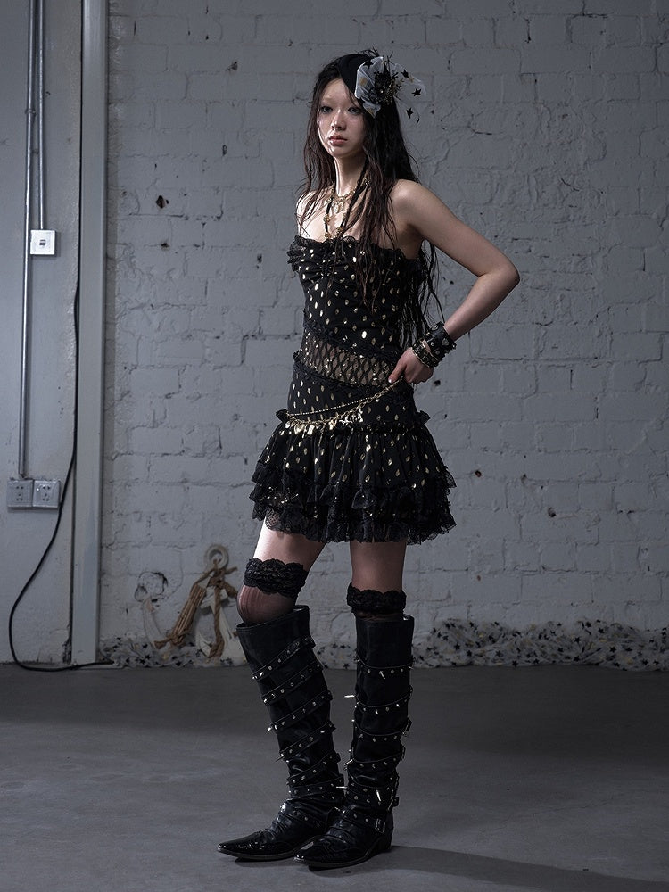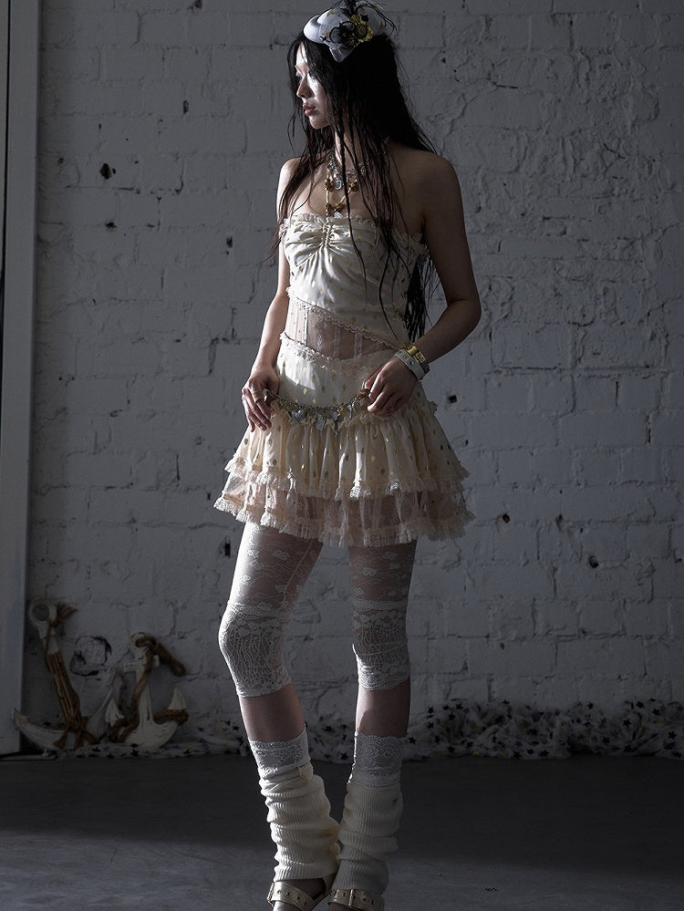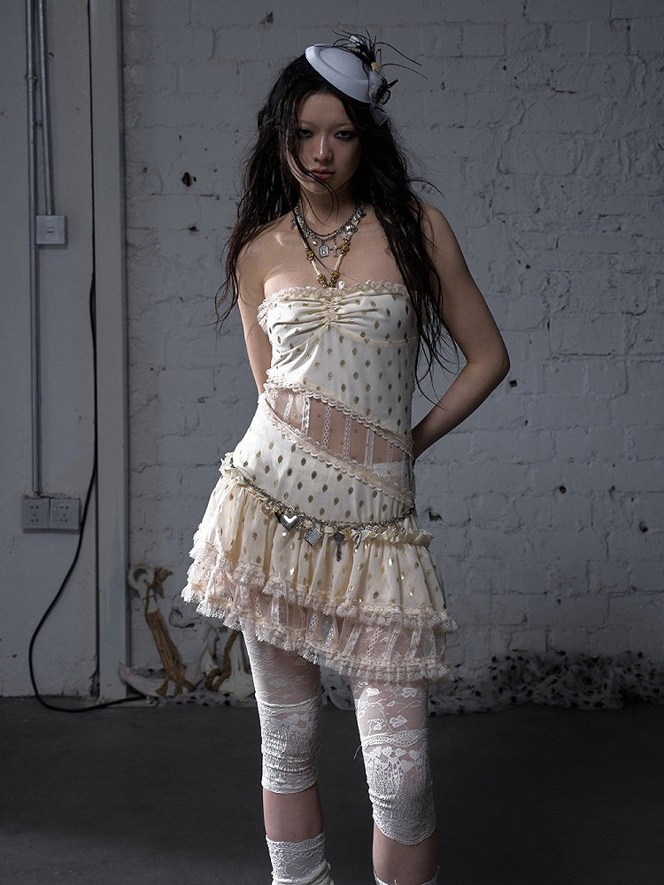 Beige/Black Halter Neck Lace Patches Waist Polka-dot Vintage Strapless Dress