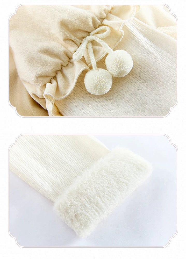 This faux two-piece ensemble features a fabric of substantial thickness, ensuring comfort and warmth. The shoulder area is adorned with delightful ruffled flutter sleeves, adding a whimsical touch. At the center front, a beautifully embroidered floral pattern in vibrant hues captures attention, while two pom-pom bow accents on the sleeves add playful elegance. The collar, cuffs, and hem are crafted from a soft, fluffy material, enhancing its overall cuteness and providing a cozy feel.