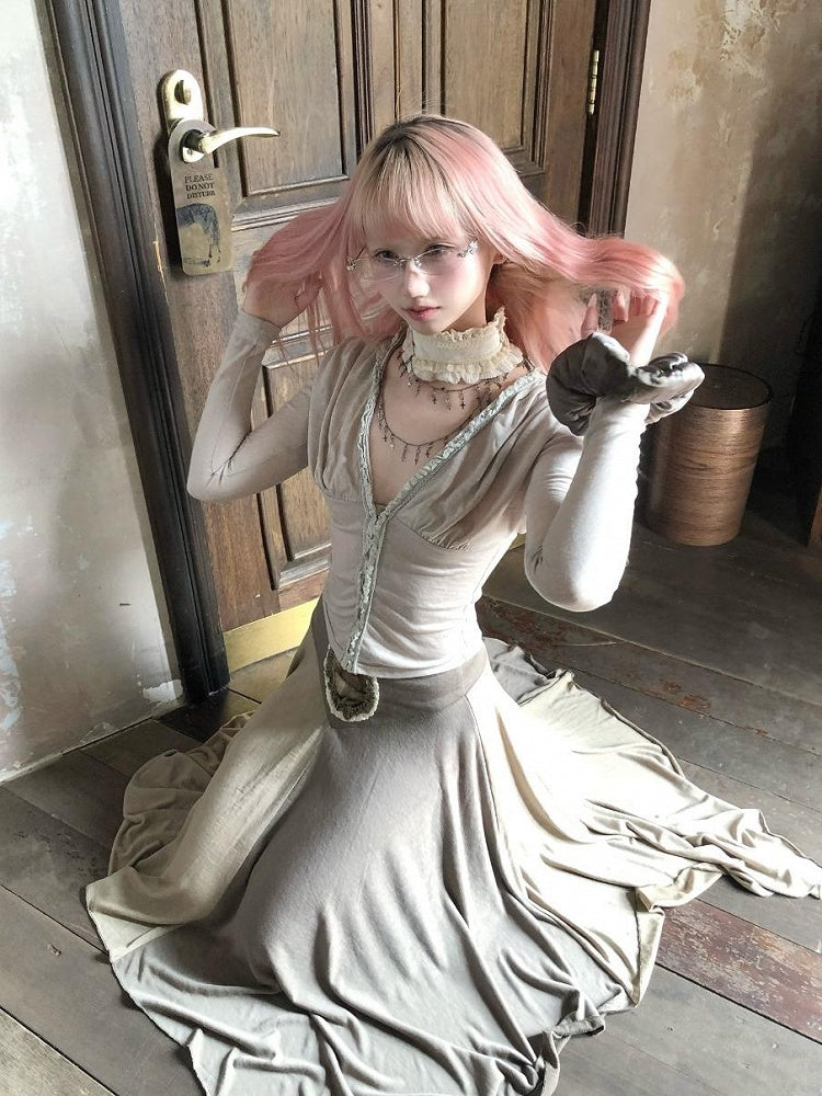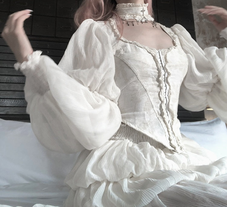 This beige choker combines delicate lace with ruffled edges. A bold chain cross pendant creates striking contrast. Blends vintage charm with contemporary edge. Versatile for both casual and formal styling. Embodies timeless elegance with modern flair.