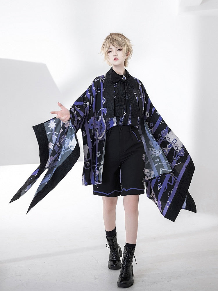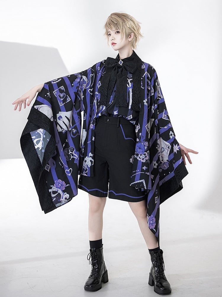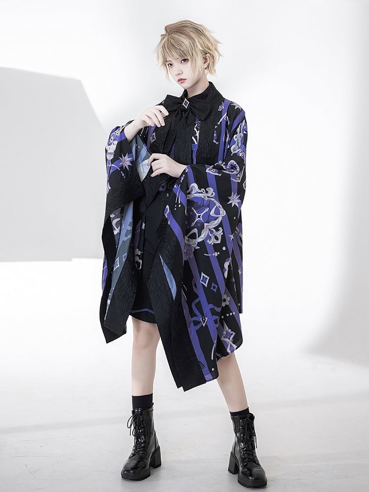 Ouji fashion pastel goth summer top, mystery purple and black stripe pattern, with alice in wonderland print includes poker, tea cup, teapot and roses. Ouji lolita magician haori.
