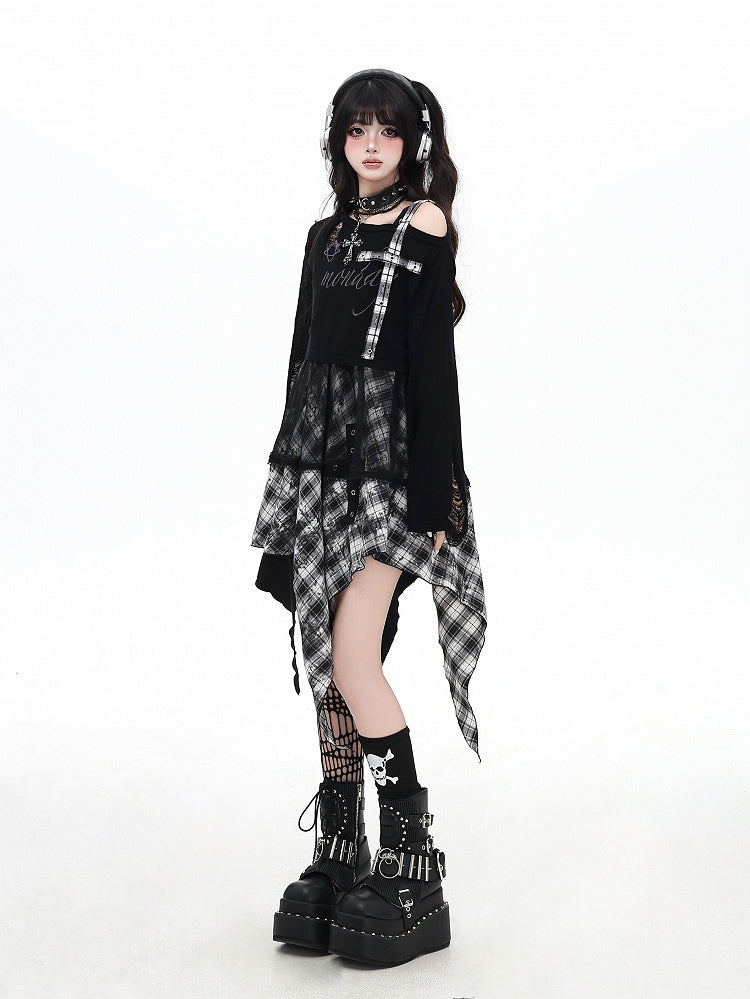 Black and White Plaid Handkerchief Hem Sleeveless Dress With Overlay Two Ways Wear