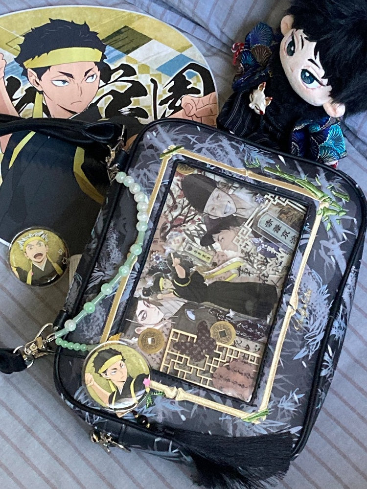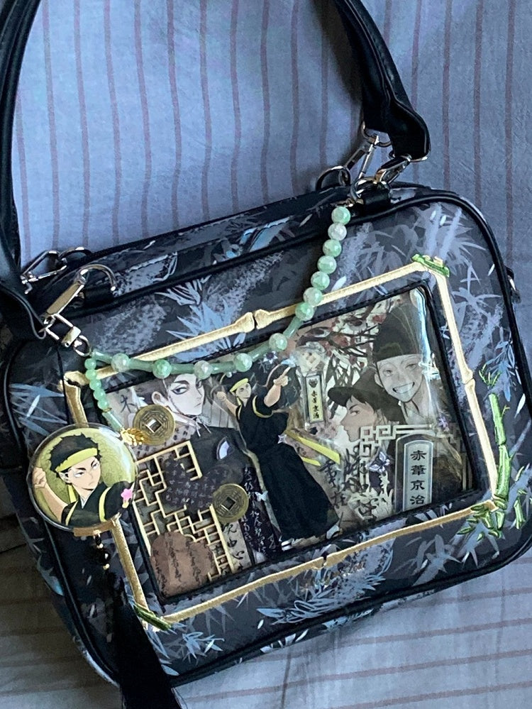 Black Bamboo Leaf Pattern Cheongsam Style Ita Shoulder Bag with Detachable Beaded Chain