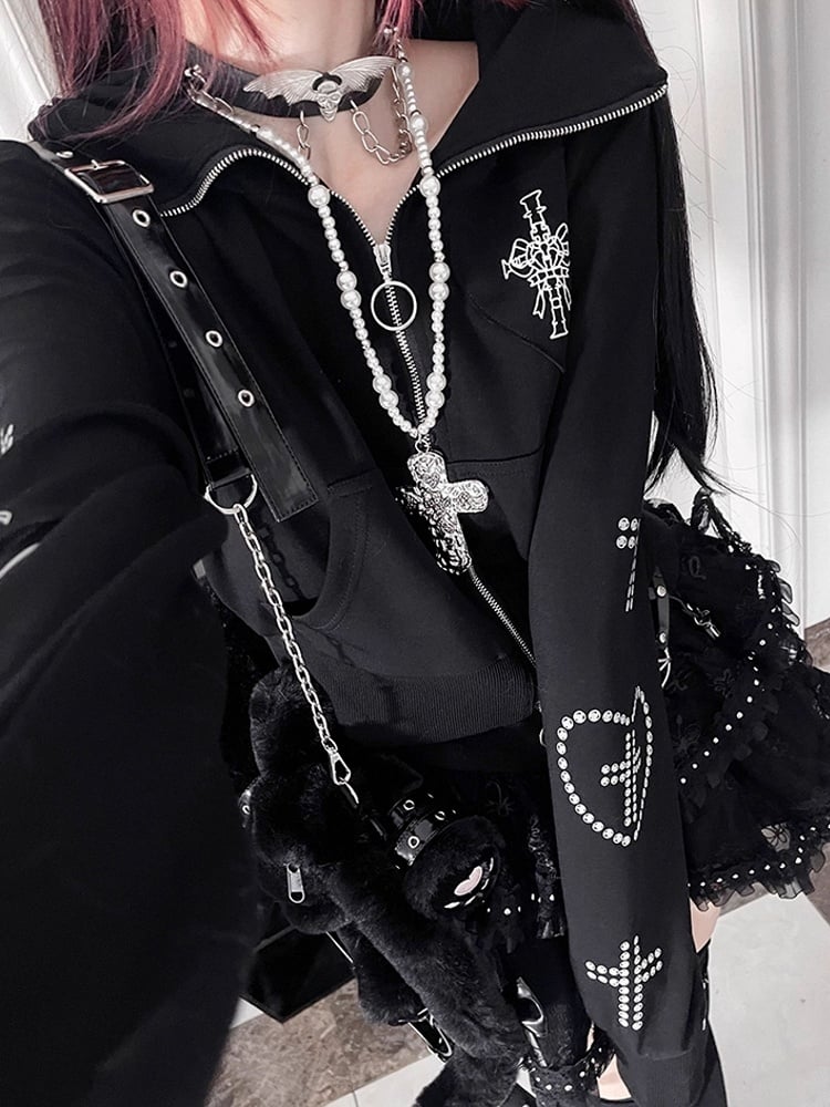 Discover the perfect blend of edgy and sweet with this Bittersweet Black Hoodie. Adorned with striking cross and heart embellishments, this piece captures the essence of gothic elegance and kawaii charm. The cozy hood and soft fabric ensure comfort, while the detailed decorations add a touch of intrigue and style to your ensemble. Ideal for those who love to express their unique fashion sense, this hoodie is a must-have for your wardrobe.
