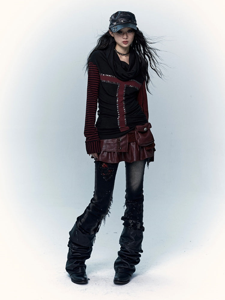 Black&Brown/Red&Black Striped Sleeves Top with Cross Design