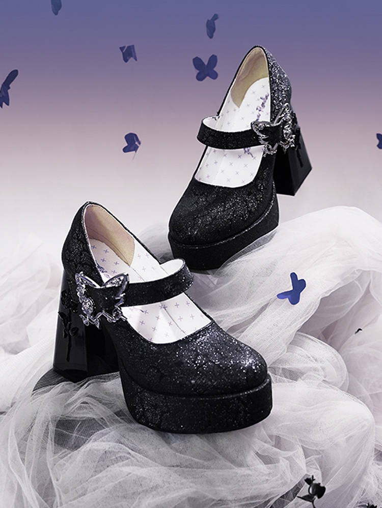These shoes feature a thick platform and chunky high heel design, perfect for adding a touch of elegance and height to your outfit. The shoes are adorned with fine glitter that shimmers differently under various lighting conditions, ensuring an eye-catching sparkle with every step. The heel is also embellished with the same glitter effect for a cohesive look.A special touch is the custom-made butterfly rose buckle, adding a unique and delicate detail to the overall design. Additionally, the heels boast intricate 3D rose flower reliefs on both sides, enhancing the shoes' luxurious appeal.