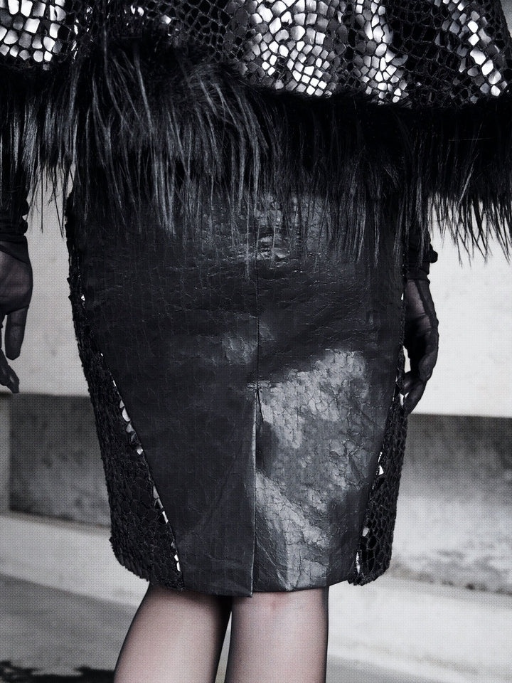 This A-line skirt features a unique cracked texture crafted from high-quality PU leather, exuding an air of mysterious sophistication, designed for the Goth Office Lady who dares to make a statement. The back slit and central zipper not only add to its chic design but also ensure ease of movement and a perfect fit. The standout feature of this skirt is the triangular scales of plush fabric, intricately stitched on both sides, offering a striking contrast and a touch of avant-garde flair. Perfect for transitioning from the boardroom to an evening out, this skirt embodies a bold blend of gothic allure and professional poise.