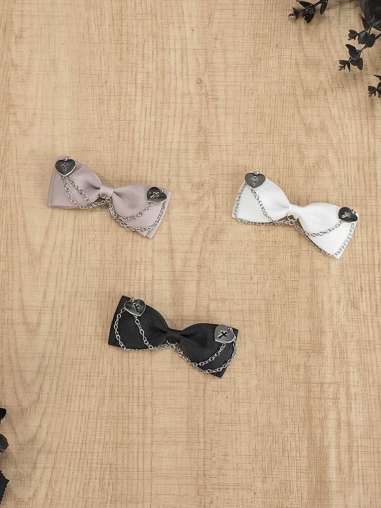 Black/Dusty Pink/White Gothic Cross Hearts Jirai Kei Bowknot Hairclips with Chains
