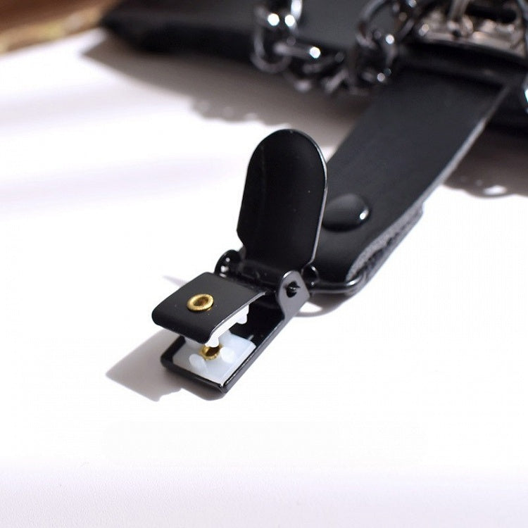 Add a touch of punk and gothic flair to your outfit with our black PU garter with chains. This edgy accessory features a sleek black leather band adorned with chains, perfect for adding an element of rebellious style to any look.