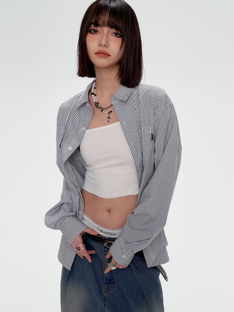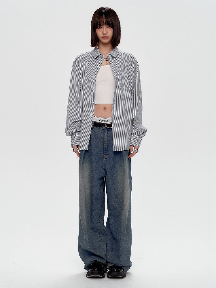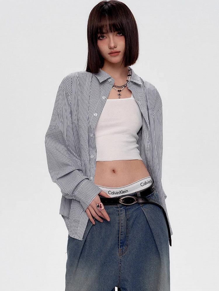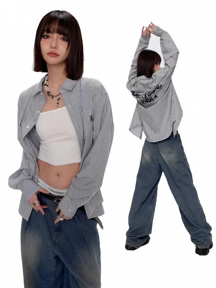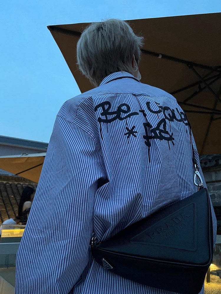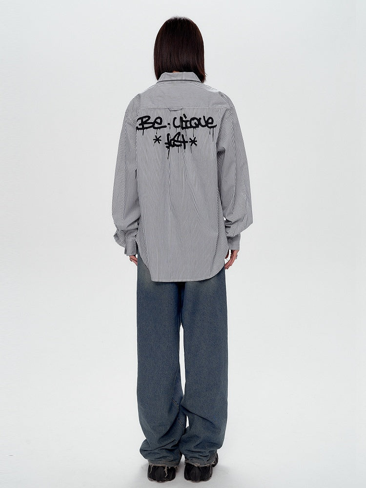 Elevate your wardrobe with this chic Unisex Preppy Shirt, a perfect blend of classic style and modern edge. Featuring a timeless blue and white striped pattern, this shirt brings sophistication to any ensemble. The shirt collar and button cuffs add a touch of formality. What sets this shirt apart is the bold black graffiti letters adorning the back, injecting a unique, artistic vibe into the preppy aesthetic. The front button placket ensures easy wearability while maintaining a polished look.