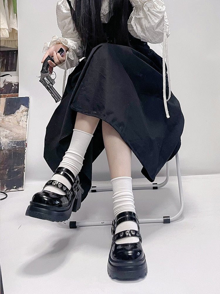 Step into a world of whimsical charm with these platform shoes, designed to elevate your style with their chunky heel and bold silhouette. Adorned with heart-shaped metal stud embellishments, these shoes capture the playful essence of kawaii fashion. The adjustable buckle strap ensures a secure fit, allowing you to dance through your day with confidence and flair. Perfect for those who love to make a statement with every step!
