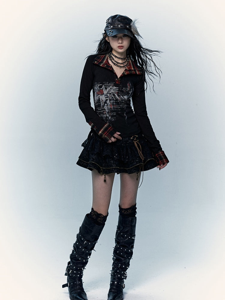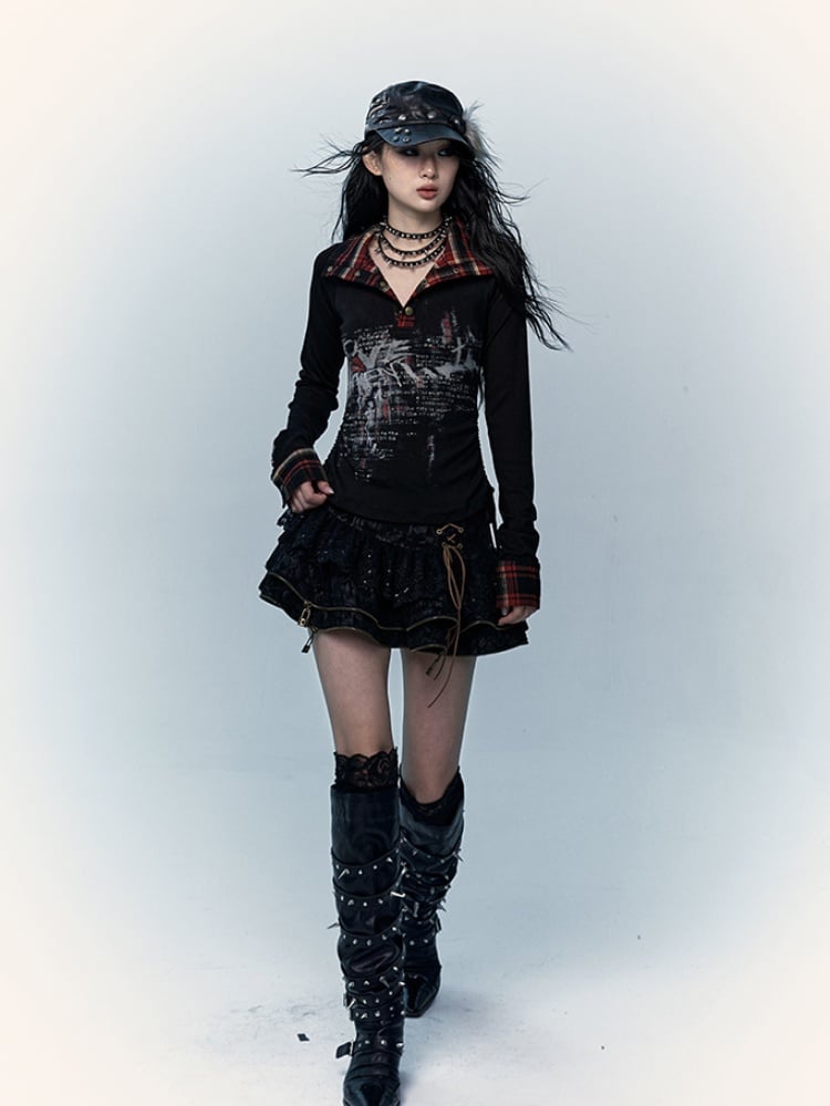 Black Lace Trim Skirt - Zipper & Lace-Up Design