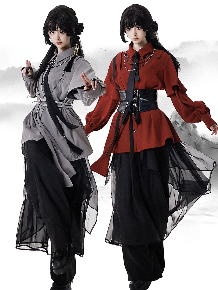 These black chiffon trousers draw inspiration from warrior attire, featuring layered sheer panels and a loose, flowing silhouette. The lightweight fabric creates dynamic movement with each step, perfect for pairing with fitted tops or modern pieces to bridge traditional martial aesthetics and contemporary fashion.