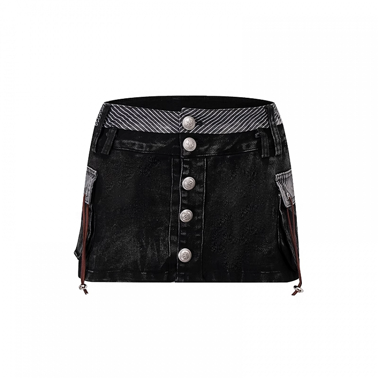 Elevate your edgy style with this chic black mini skirt, expertly crafted with a low-rise fit to accentuate your silhouette. The distressed detailing adds a touch of rebellious flair, while the silver-tone buttons provide a sophisticated contrast.