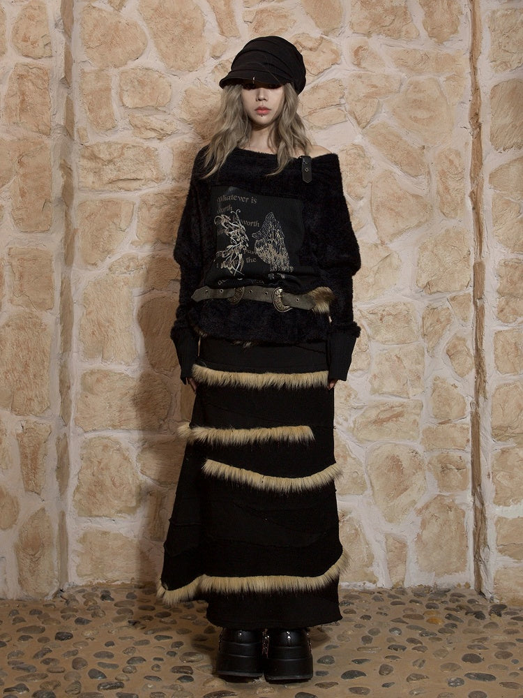 This knit top features a unique textured fabric panel in the center, adorned with English lettering and wing prints. Designed with batwing sleeves and a relaxed off-shoulder neckline, it includes an adjustable PU strap with a metal buckle on one side. The buttoned cuffs complete this punk-inspired, Shibuya street style essential.