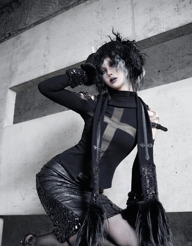 Crafted for both style and comfort, it features cross-shaped mesh panels that add a mysterious allure to your look. The top boasts a luxurious faux wool texture, offering a soft and skin-friendly feel that is perfect for all-day wear. The cuffs are adorned with fold-over fish scale-like plush, which glistens with an eye-catching shine yet remains soft to the touch. A detachable turtleneck scarf adds versatility and can be worn or removed as desired. The convenient back zipper ensures easy dressing and a perfect fit. This top is a striking piece for anyone looking to make a bold fashion statement.