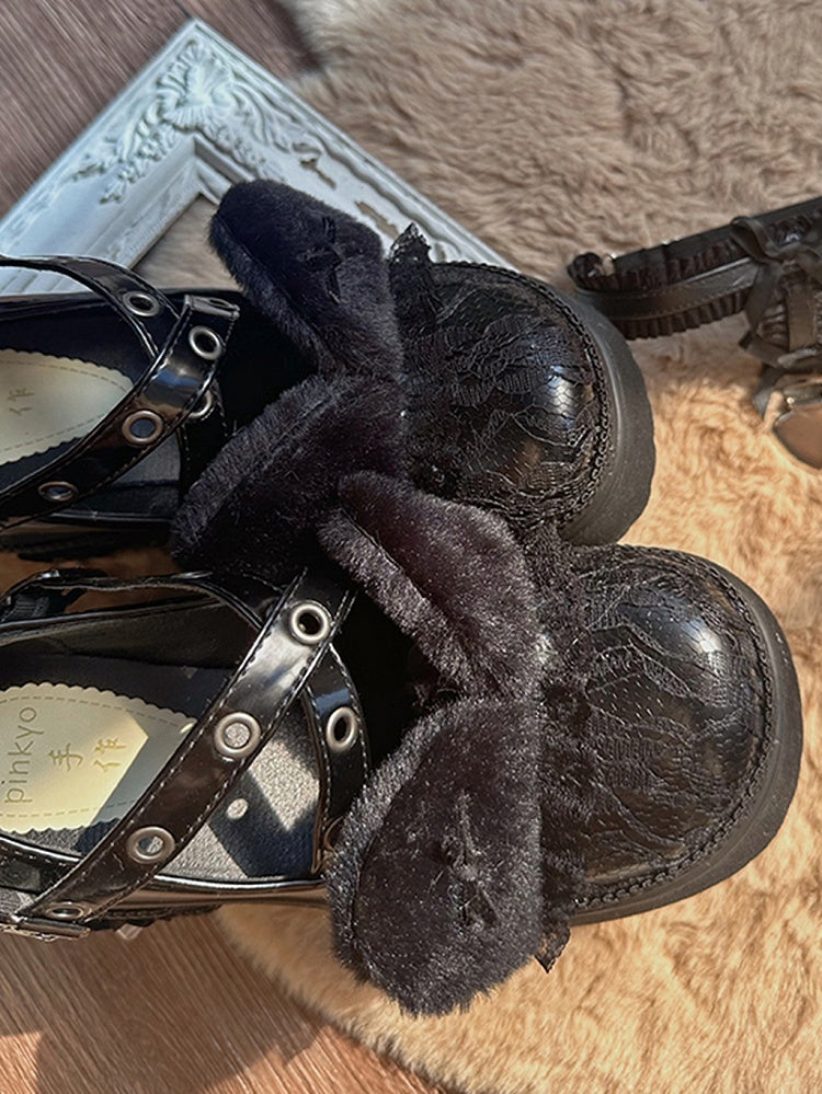 Black Plush Kitty Ear Lace Platform Mary Janes