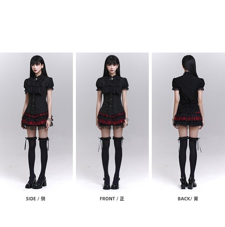 Elevate your wardrobe with this exquisite Gothic Black Puff Sleeve Blouse. Crafted for those who adore a touch of elegance with a dark twist, this blouse features dramatic puff sleeves that add volume and a sense of mystique to your silhouette. The detachable jabot tie offers versatility, allowing you to switch between a classic or more understated look.