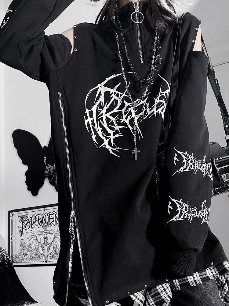 Dive into the edgy allure of emo punk fashion with this striking black and white sweatshirt. Featuring a chic mock neckline, this piece offers a modern twist with its bold shoulder cutouts, effortlessly blending rebellious style with a hint of sophistication. Perfect for those who love to make a statement, this sweatshirt is both comfortable and fashion-forward, ideal for adding a touch of punk flair to any outfit.