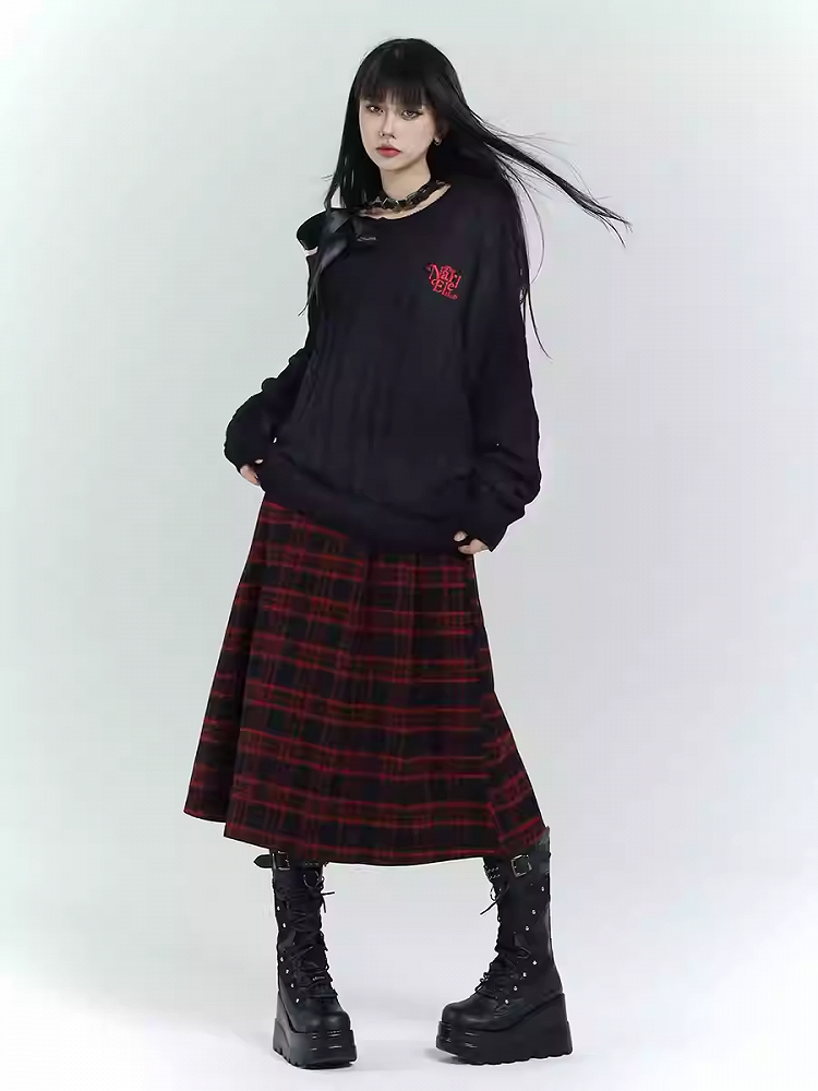 Black & Red Plaid Double Buckles Midi Length Skirt