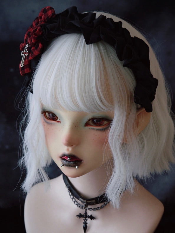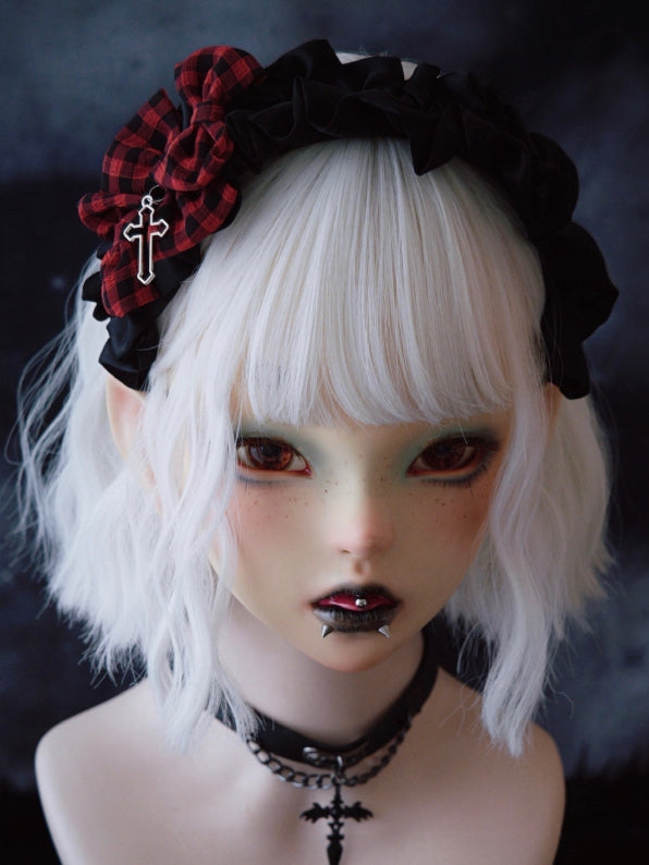 Black Ruffle Trim With Three Plaid Pattern Bowknots Cross Charm Design KC