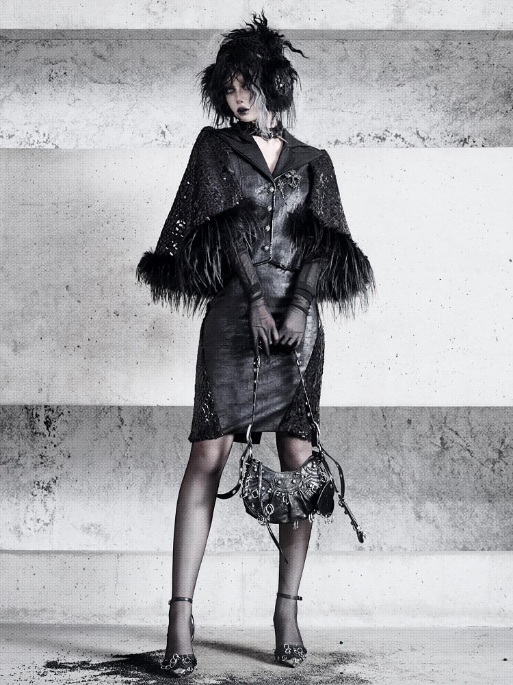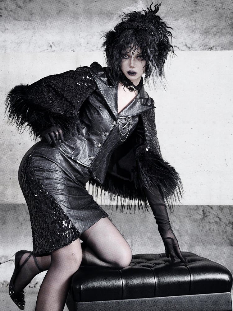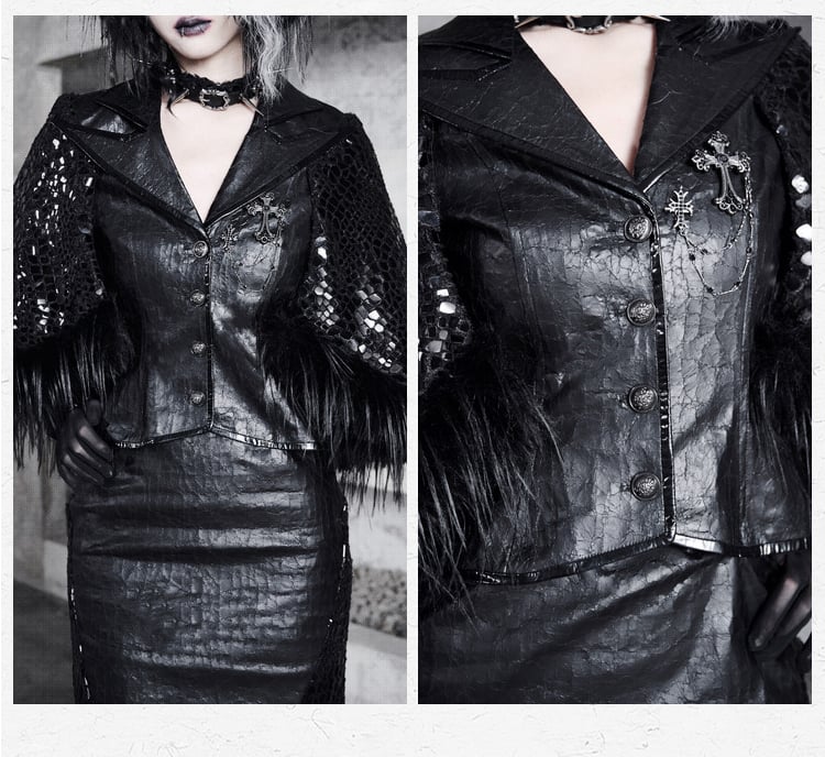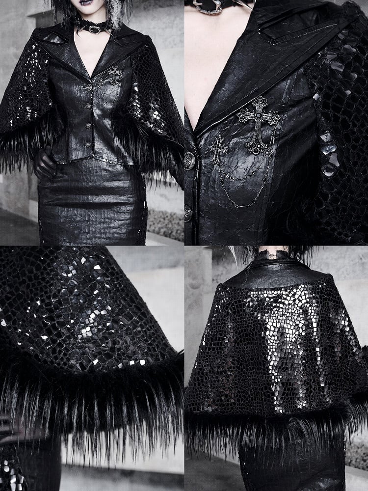 This unique piece features a striking PU leather exterior with a luxurious satin lining, ensuring comfort and style. The blazer's standout element is its fixed black short cape, adorned with glossy lacquered scales that mimic a fish scale pattern, adding a touch of avant-garde flair. The cape is crafted from black fleece fabric, providing a soft, textured contrast to the sleek PU leather. With its three-quarter sleeves and metallic button closure, this blazer is perfect for making a bold fashion statement while maintaining a polished, professional look. Ideal for the modern woman who isn't afraid to express her individuality in the workplace.