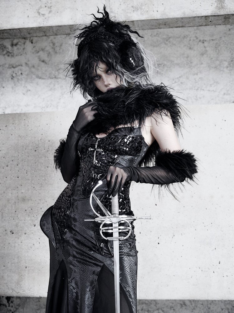 This striking mermaid dress is crafted from luxurious snakeskin grain PU leather, offering a unique blend of mirror-like sheen and plush texture. The bodice features a dramatic black sequined and scaled detail that adds a touch of opulence. The gown's silhouette is enhanced by an exquisite fishtail skirt, adorned with black beaded details mesh, creating a stunning visual contrast. For added versatility, the dress includes a detachable gunmetal cross accessory and a removable metal chain, allowing you to customize your look. The expertly designed curvilinear hip structure provides a flattering silhouette, accentuating your figure beautifully. Adjustable spaghetti straps ensure a perfect fit, while a discreet side zipper offers ease of wear.