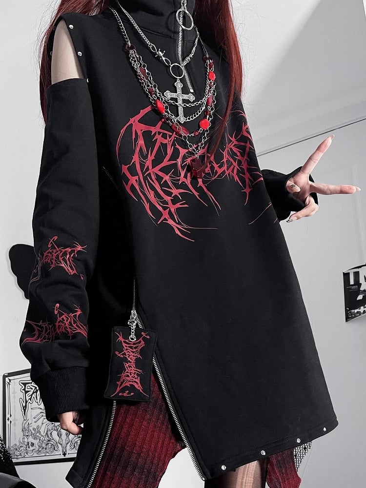 Dive into the edgy world of Emo Punk fashion with this striking black and red high-collar sweatshirt. Featuring a unique shoulder cutout design, it blends rebellious spirit with a hint of allure. Perfect for those who love to stand out and express their individuality, this sweatshirt offers a bold statement while ensuring comfort and style. Ideal for pairing with your favorite jeans or skirts for an effortlessly cool look.