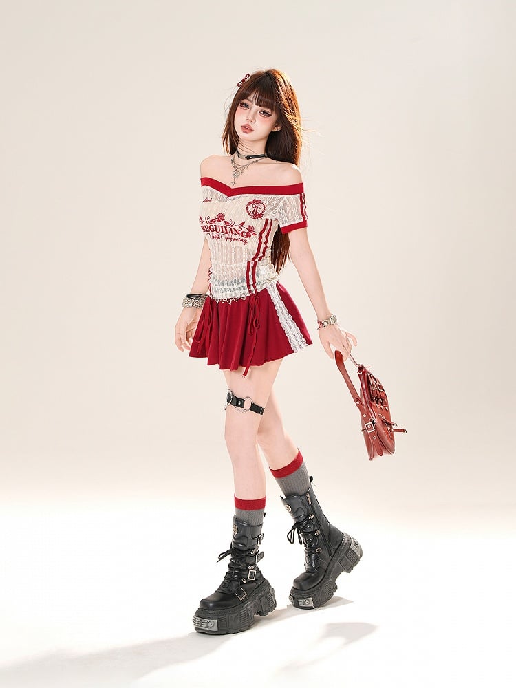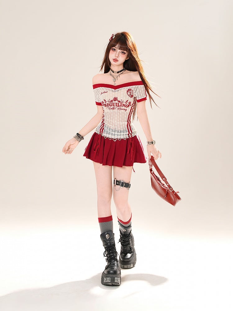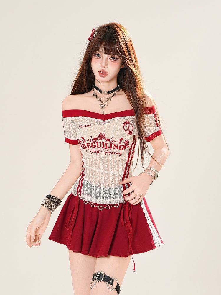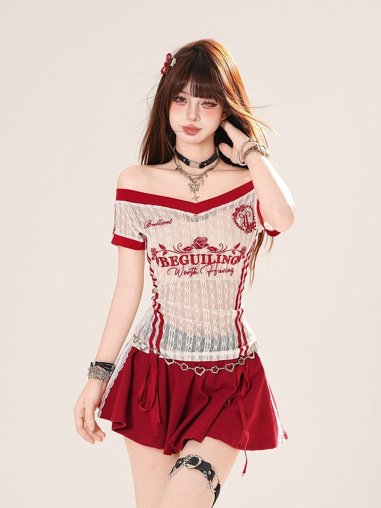 Black/White Off-the-shoulder Neckline Semi-sheer Lace T-shirt