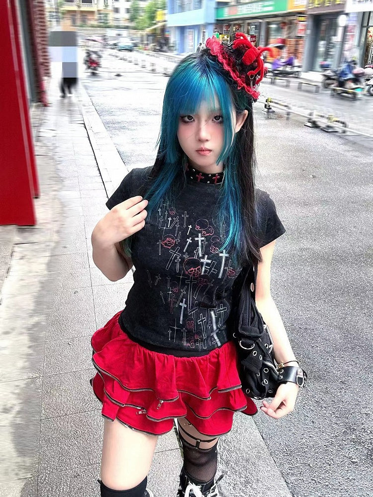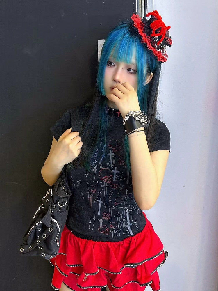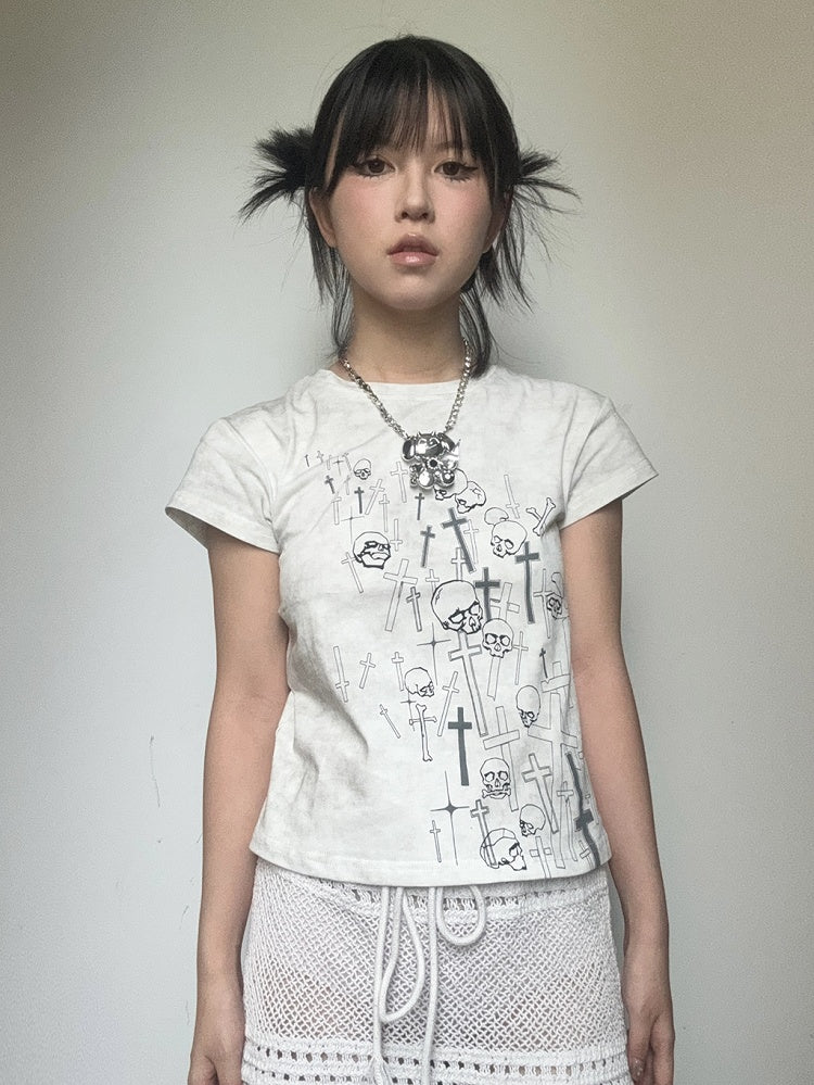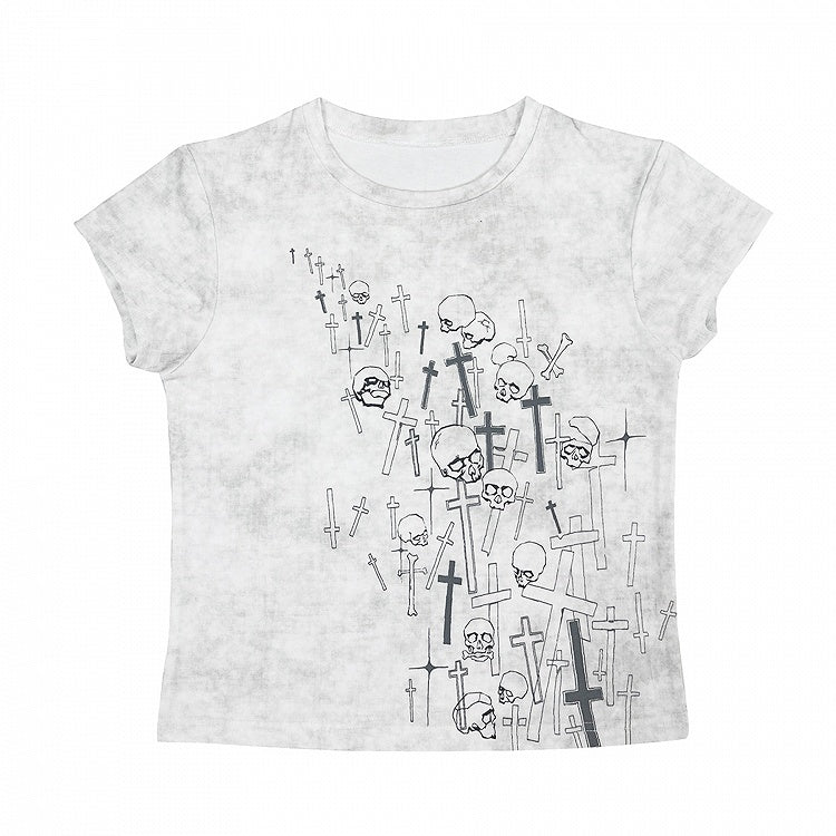This top features the same skeleton and cross pattern on both the front and back.Unveil a blend of edgy and gothic charm with this striking top that showcases a bold skeleton and cross pattern on both the front and back. Perfect for those who love to make a statement, this top seamlessly combines dark aesthetics with contemporary style. Elevate your wardrobe with this unique piece that promises to turn heads and spark conversations.