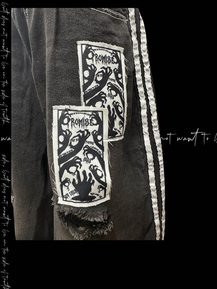 Black & White Stripes Distressed Holes Raw Hem Appliques Embellished Denim Shorts