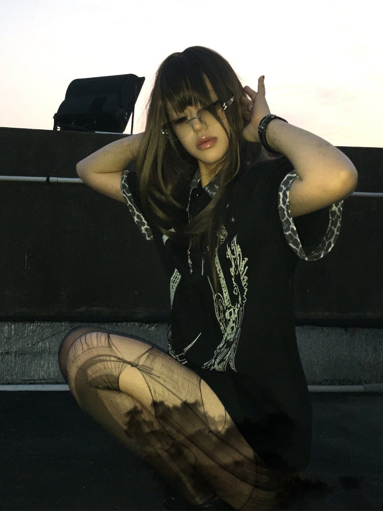 Black Y2K Punk T-Shirt with Subcultural Print & Leopard Collar