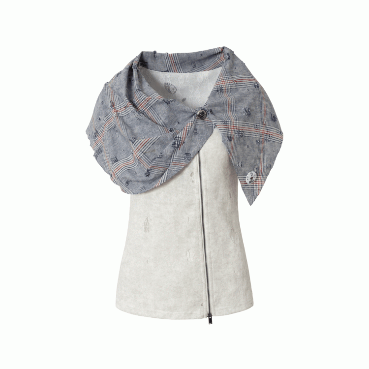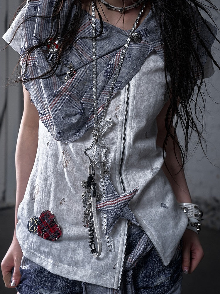 Blue and White Plaid Distressed Holes Navycore Zipper T-shirt Faux Two-pieces