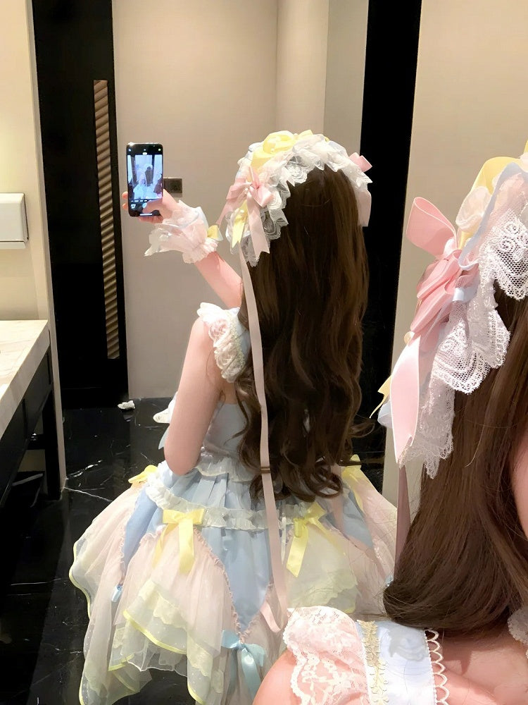 This exquisite dress embodies a perfect blend of elegance and whimsy, the bodice features a delicate corset-style back with both elasticity for comfort and lacing for an adjustable, flattering fit. A discreet side zipper ensures easy wear, combining practicality with style. The skirt cascades into a charming handkerchief hem, adorned with soft layers of tulle and playful ribbon bow accents in pastel hues.