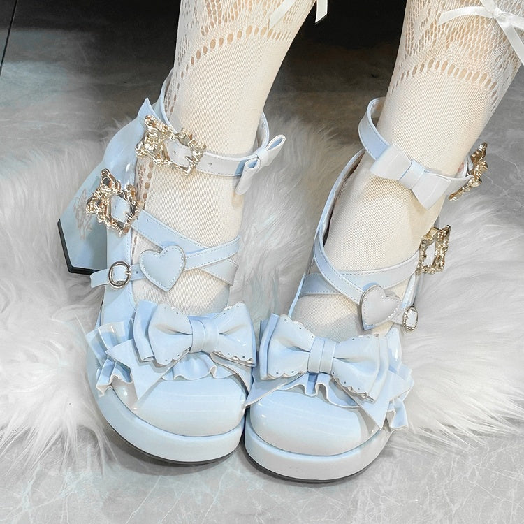 Blue Bear Buckle Straps Bowknot High Block Heels with Bear Embroidery