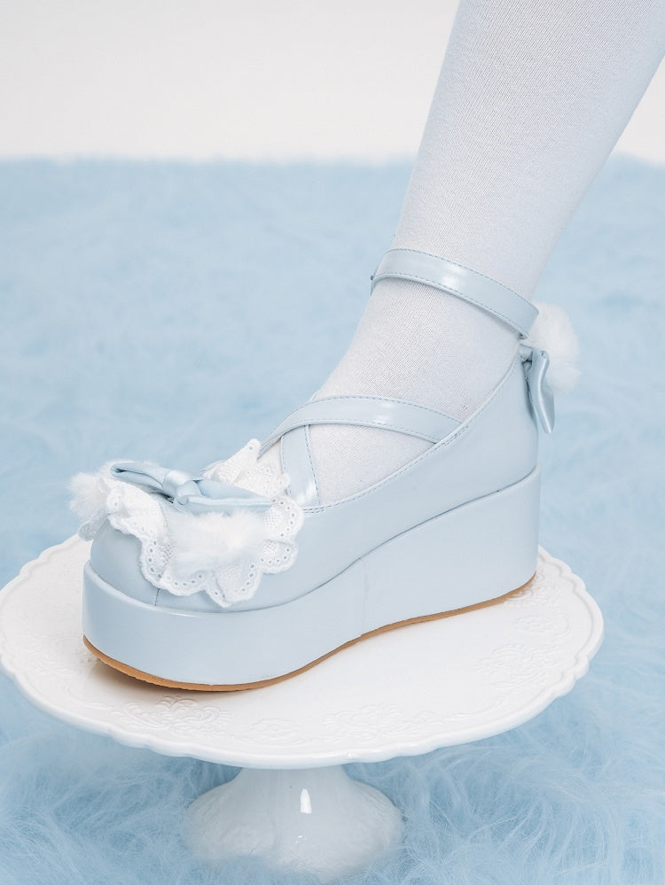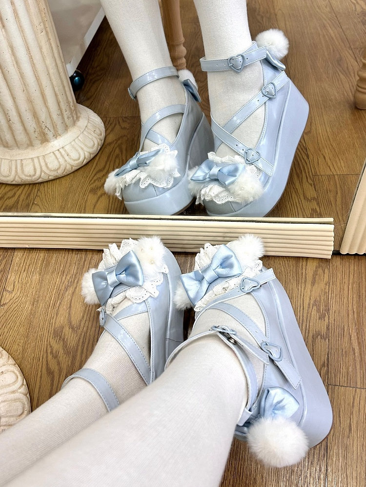 Step into a world of whimsy with these enchanting Sweet Lolita platform shoes. Featuring a charming crisscross design, these shoes are adorned with playful pom-pom accents and a plush bow topped with adorable bunny ears. The heart-shaped buckle adds a touch of romance, making these shoes the perfect blend of cute and stylish for any Lolita fashion enthusiast.