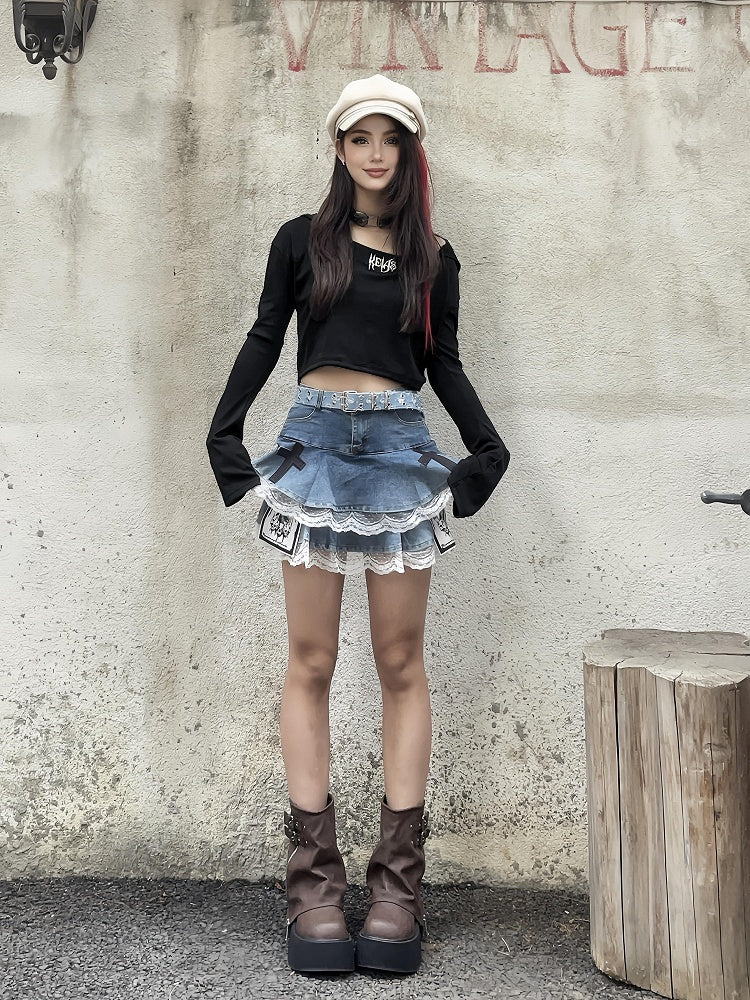 Blue Cross and Skeleton Appliques Lace Trim Glamorous Tiered Skirt