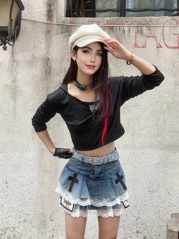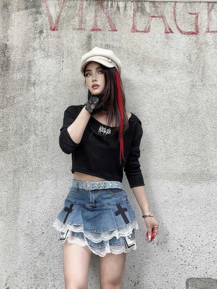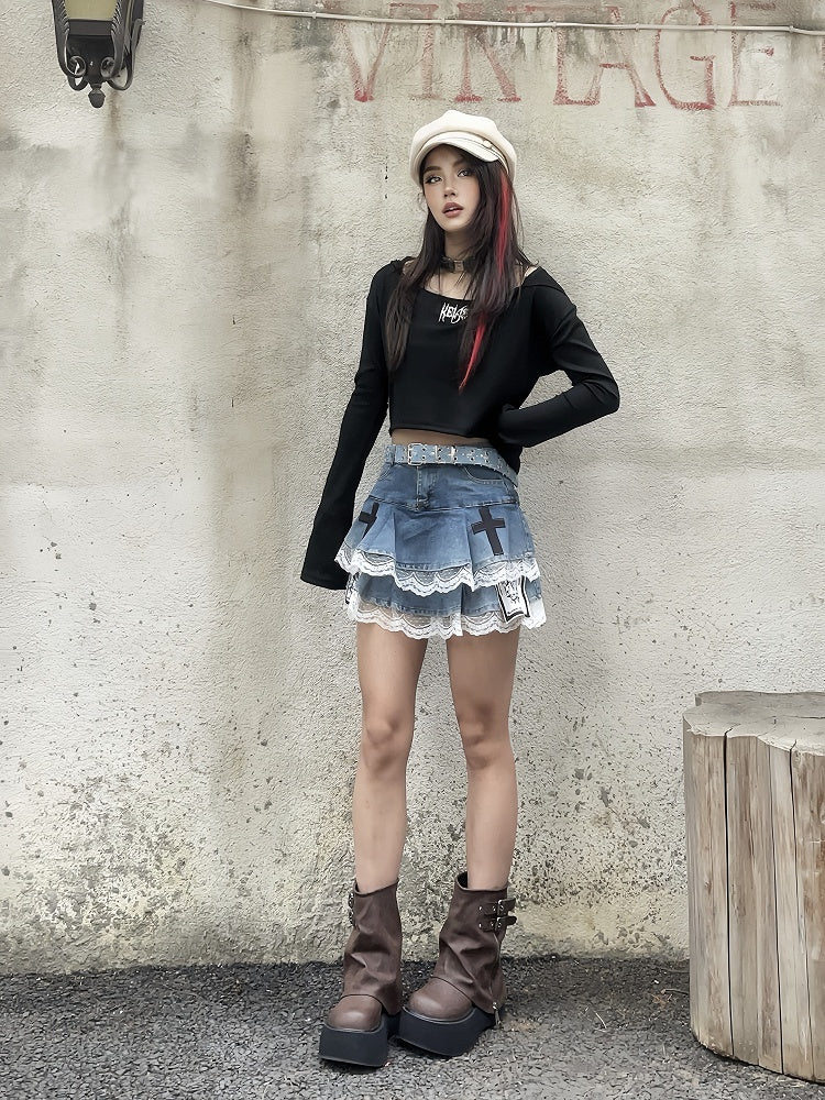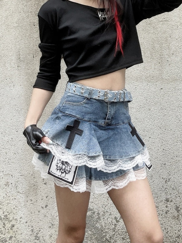 Dive into a world of whimsical charm with this captivating tiered skirt, featuring intricate blue cross and skeleton appliques. The delicate lace trim adds a touch of elegance, while the tiered design offers a playful silhouette. Perfect for those who love to blend gothic elements with a touch of kawaii fashion, this skirt is a unique statement piece for any wardrobe.