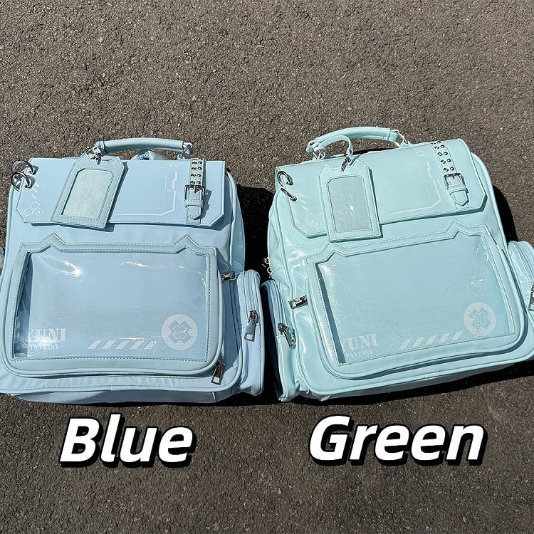 Crafted from waterproof tech fabric, this versatile bag features adjustable straps for handheld or backpack use and a card holder charm. Its clear window layer is decorated with cat ears, and the flap is accentuated with two decorative silver rings.
