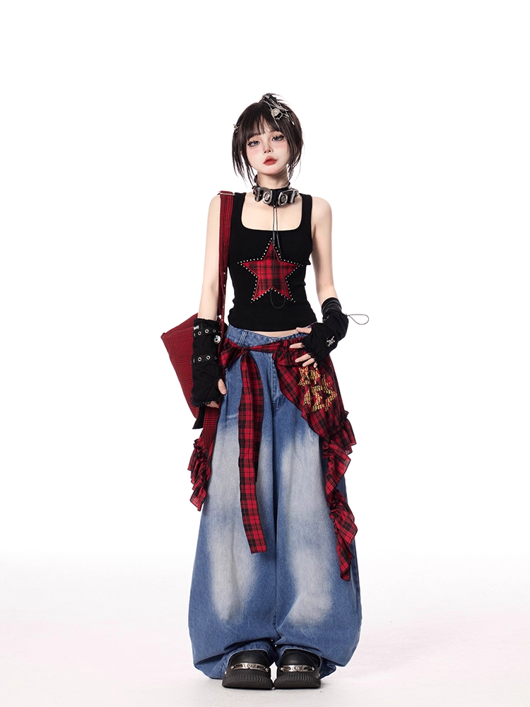 Blue Low Rise Faded Wash Vintage Wide-leg Jeans with Red Plaid Waist Accessory