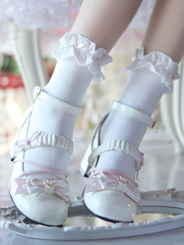 ● Bow at Top / Buckle Ankle Strap / High Block Heel / Rubber Sole